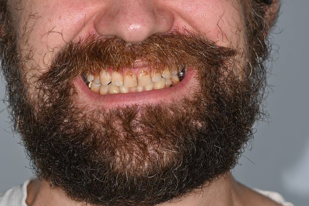 Пациент жаловался, что зубы выглядят неэстетично и иногда реагируют болью на холодное. При осмотре и по результатам компьютерной томографии мы обнаружили скрытый кариес на передних зубах на контактных поверхностях — его почти не было видно невооруженным глазом. Темные пятна на передних поверхностях зубов оказались врожденным дефектом эмали — гипоплазией. Боли они не причиняли, но пациенту не нравился внешний вид улыбки.